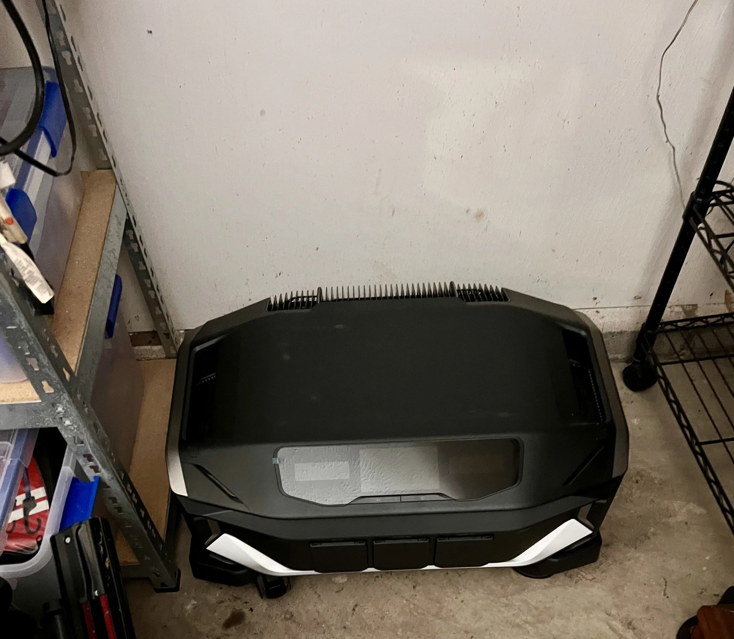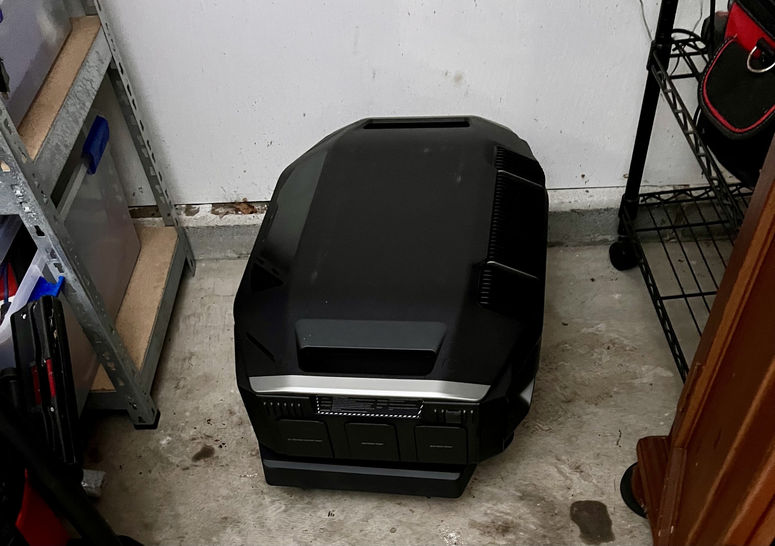 I was able to move the received box into the garage, by having the guy set it on a dolly I own. Once inside the garage, I opened up the box to ensure no visible damage, and then removed and assembled the included little wheeled base where all three units will stack. For now, I put the controller unit on the base by itself and put it over where it will live.