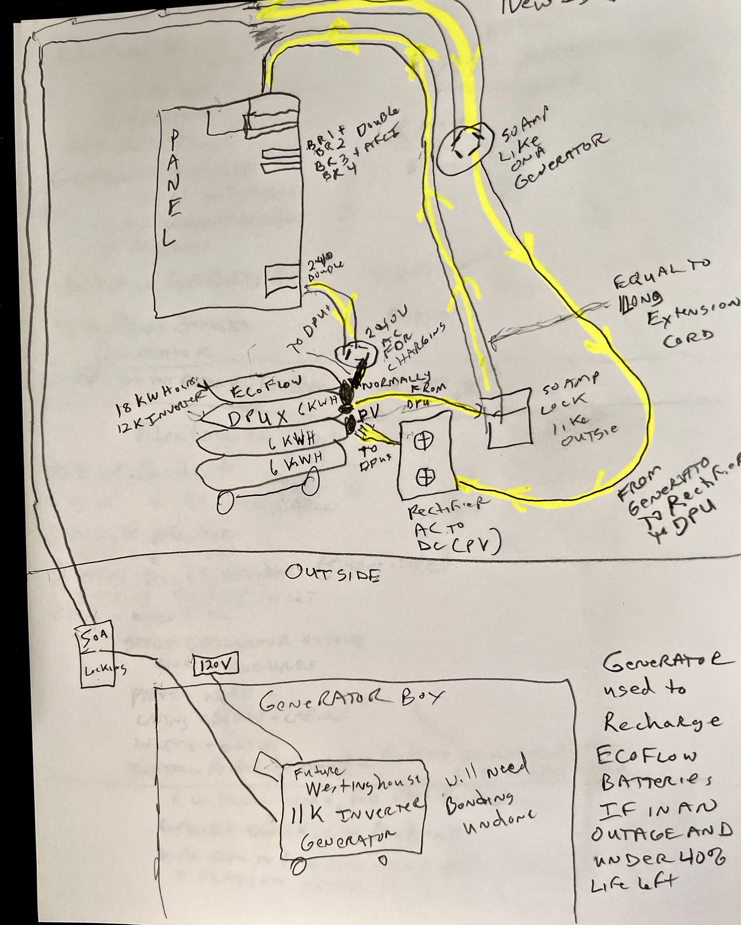 So what happens if it is a multi-day outage? That’s where the generator gets used. By adding a “generator rectifier” box between the non-inverter generator I own, and the DPUX, it will convert the 240Volt AC output from the Generator to DC output like solar panels create — photovoltaic (PV) technology. The DC (PV) electricity will charge the DPUX quickly, and can even be used as what they call “passthrough” energy. I will be using around 7200 watts from the generator (on propane) to recharge the DPUX batteries. Less than 3 hours to refill the batteries for over a half day of backup power for the house. Each 20 pound Propane tank lasts about 8 or so hours on the running generator.