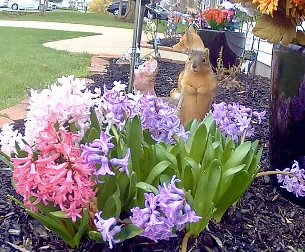 The fox is fake, the kitty is fake, but Rockette the happy squirrel, is real.