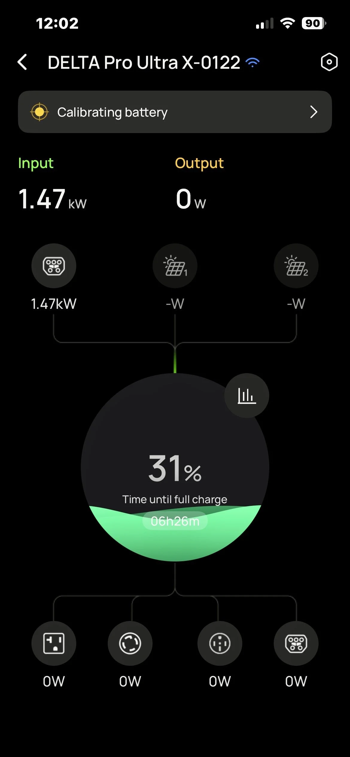 The iPhone App shows it has dropped back to pulling in 1400 watts to charge.