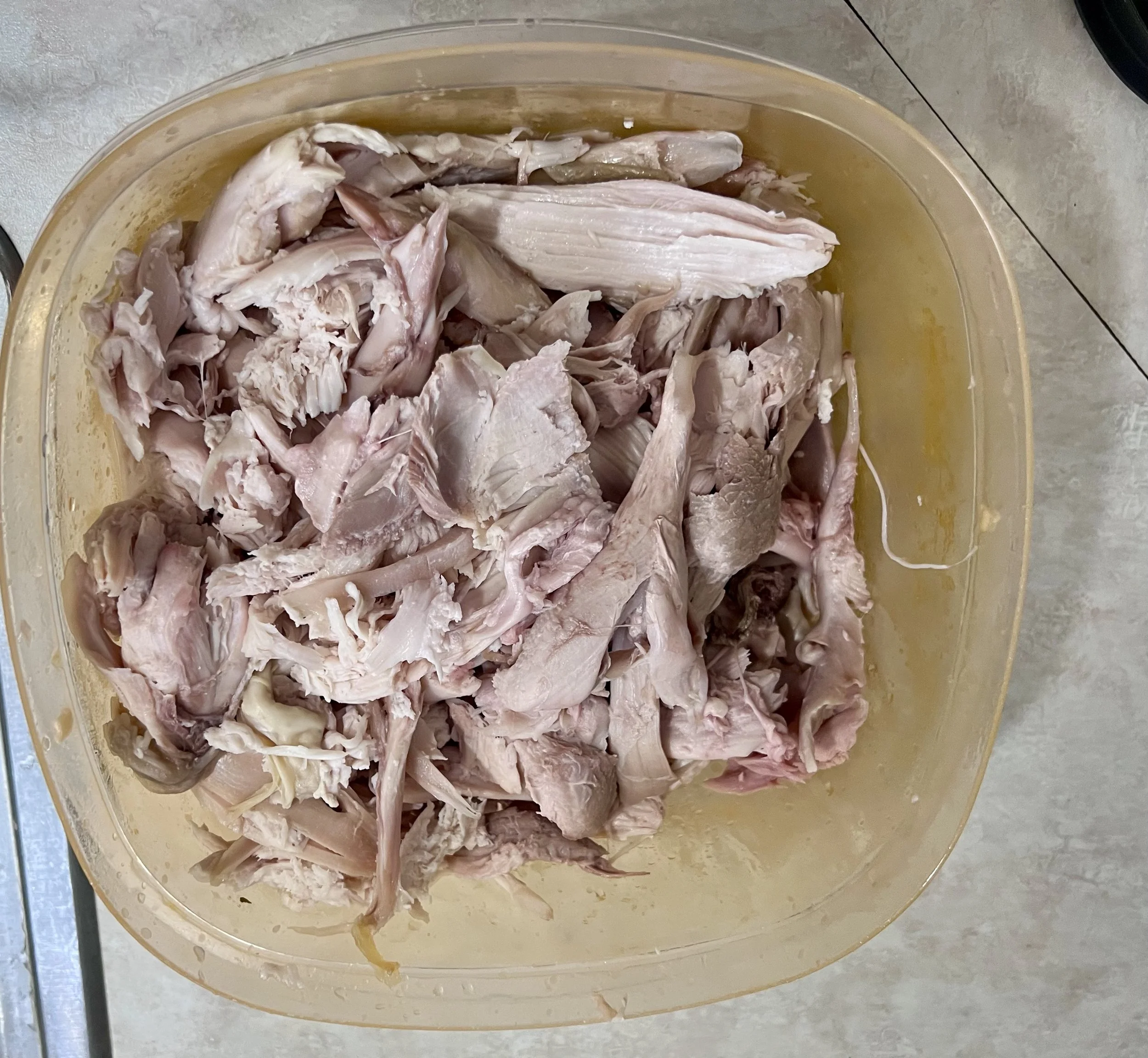 Massive rip job is complete. Yes, a good cook would have gotten another pound of meat off the bones, and then made a broth out of boiling the rest. I AM NOT A GOOD COOK. I try to make edible stuff.