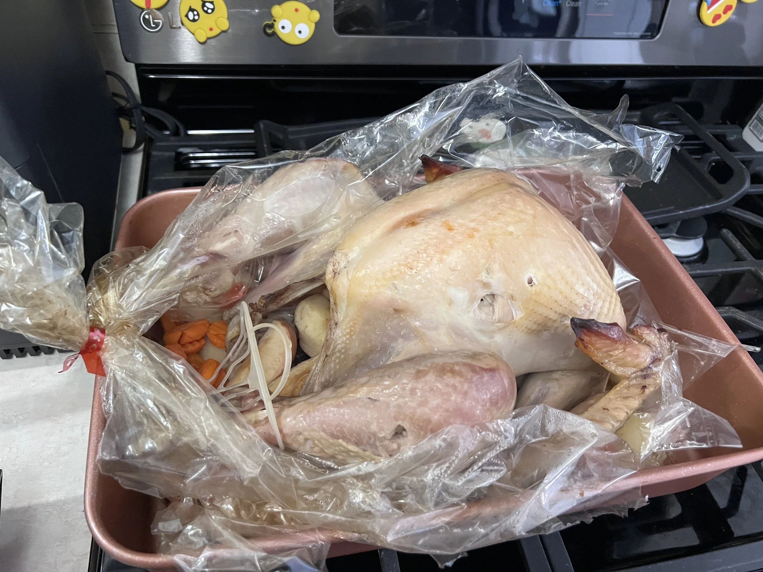 I followed through with the Turkey this morning. After rinsing it out and removing all the brine seasoning stuck inside or out, I stuffed it with cut up apples and put it into a roaster bag that I had already added a layer of potatoes, carrots, basil. Since it is meant to feed Kitty, along with me, I couldn’t use some things like onions or too much pepper or garlic. All are not good for a cat.