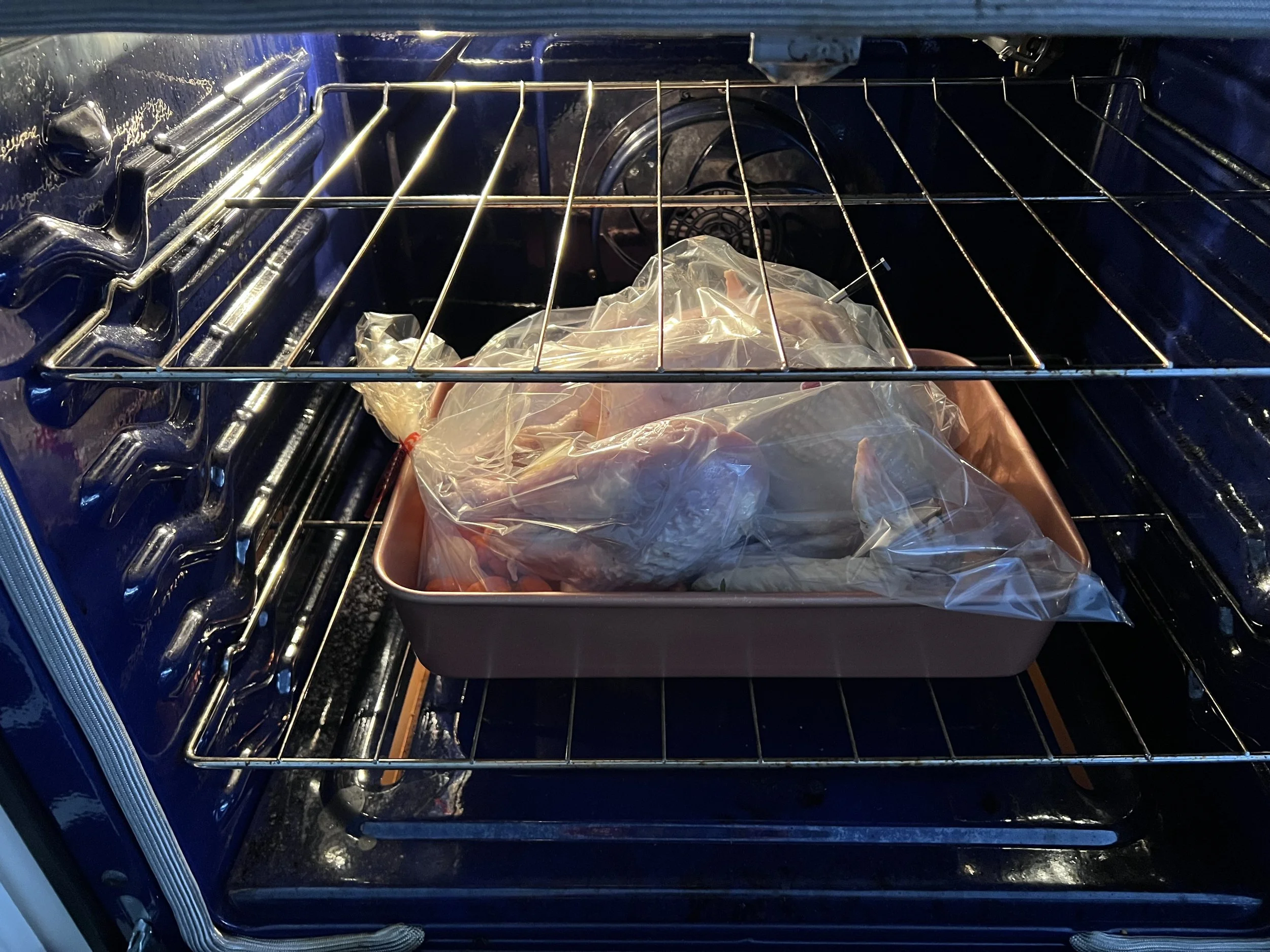 Into the oven it went. Complete with a bluetooth thermometer to tell me when it hit 165 degrees in the deepest part of the breast.
