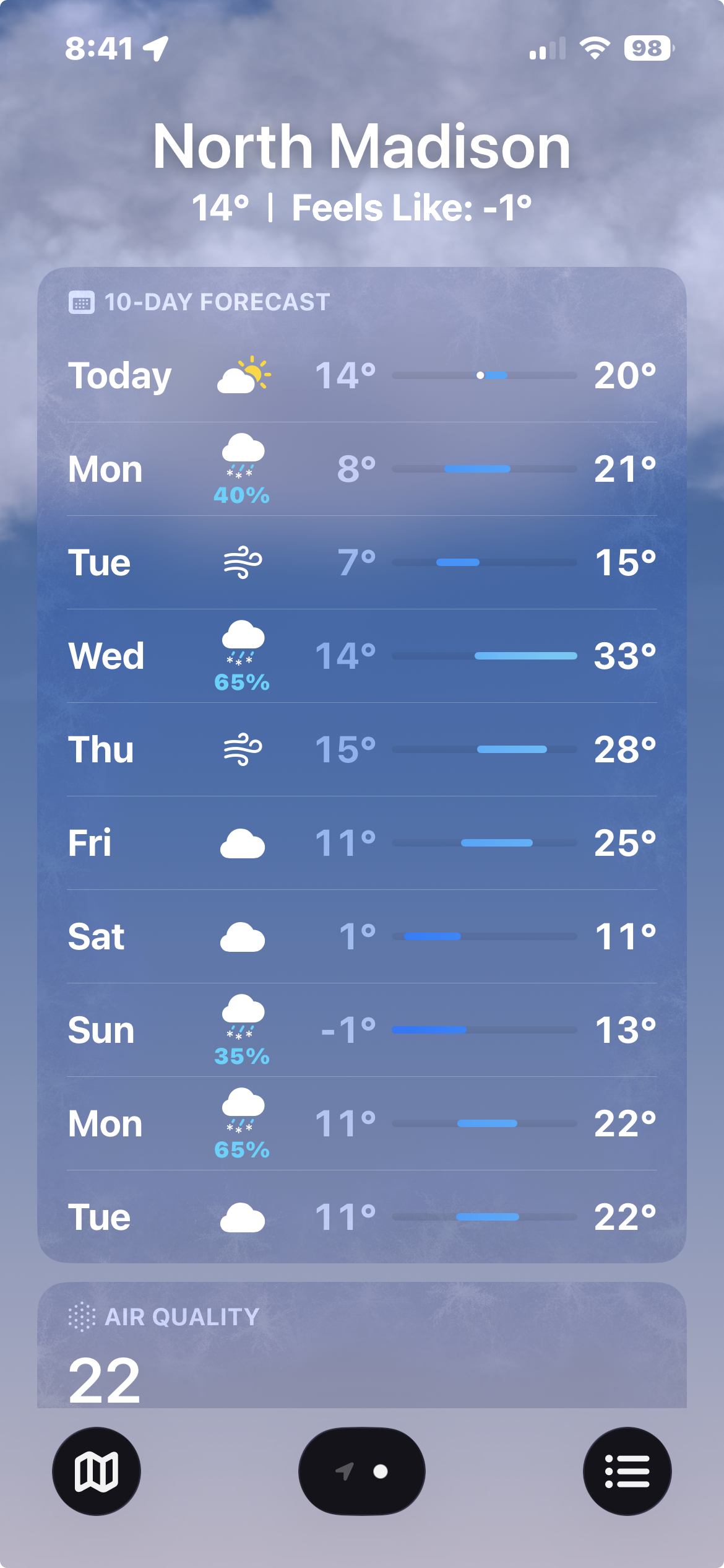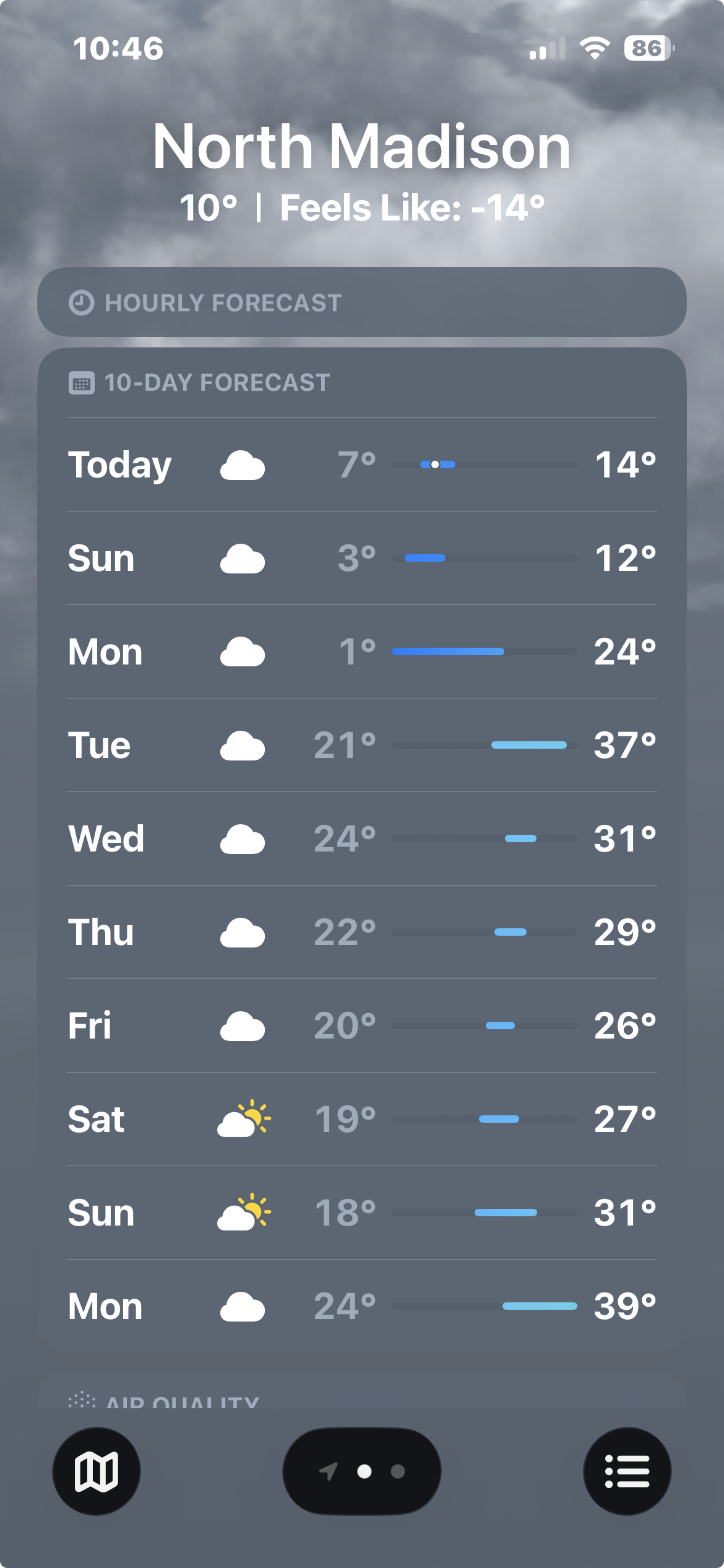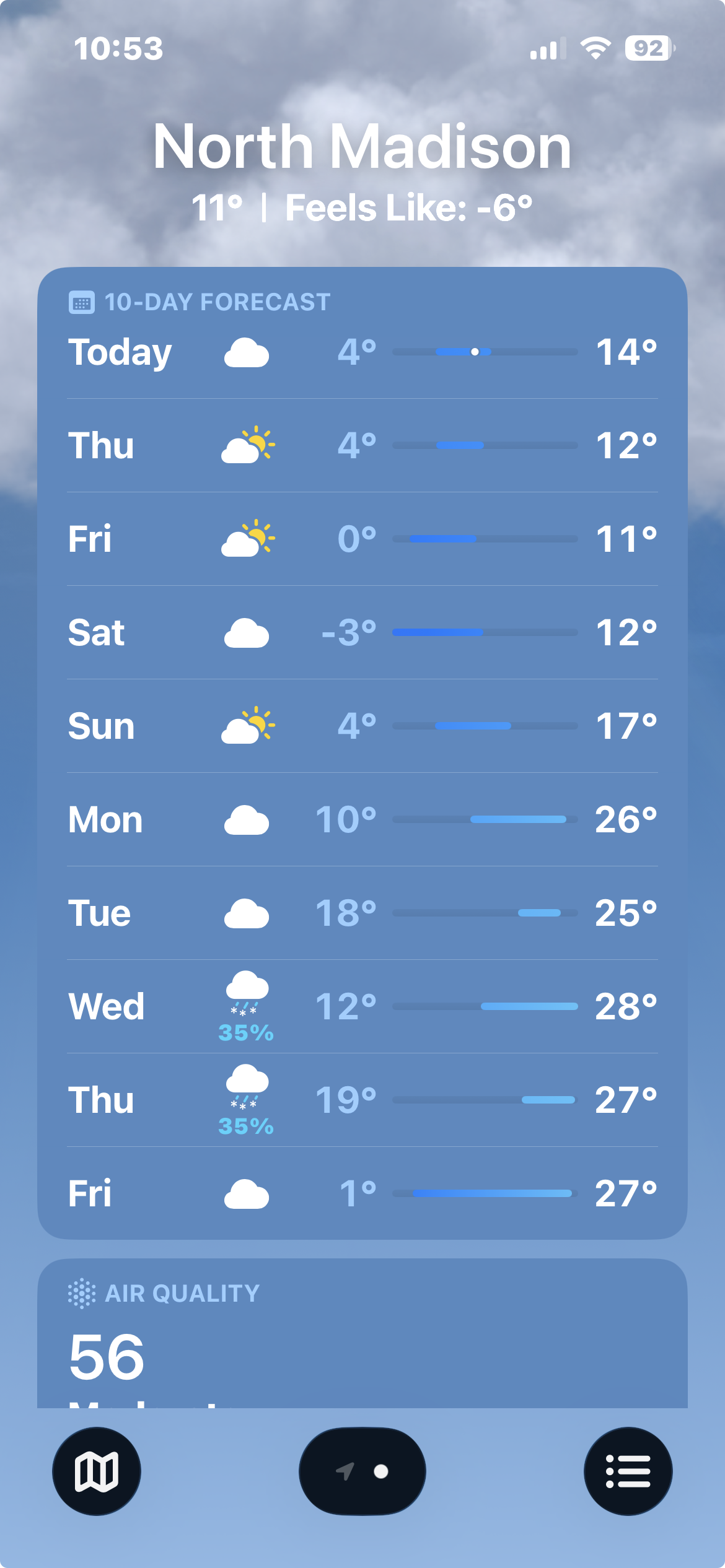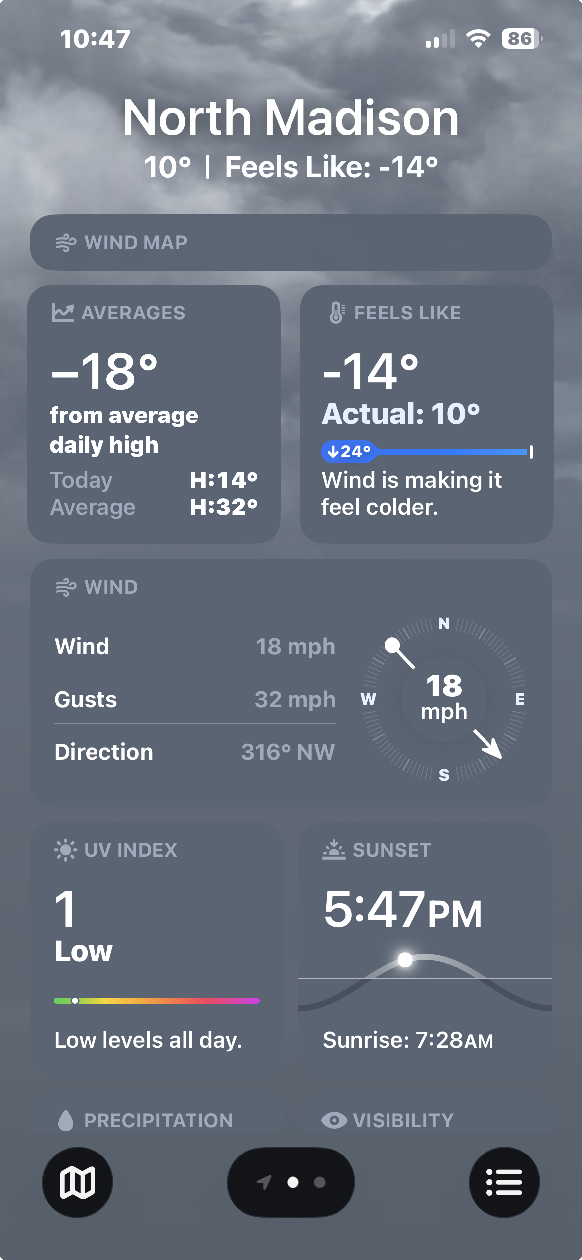 With the “lighter’ winds running around 18-32 mph, the real-feel temperature is a delightful MINUS 14. And this is up from the wee hours.