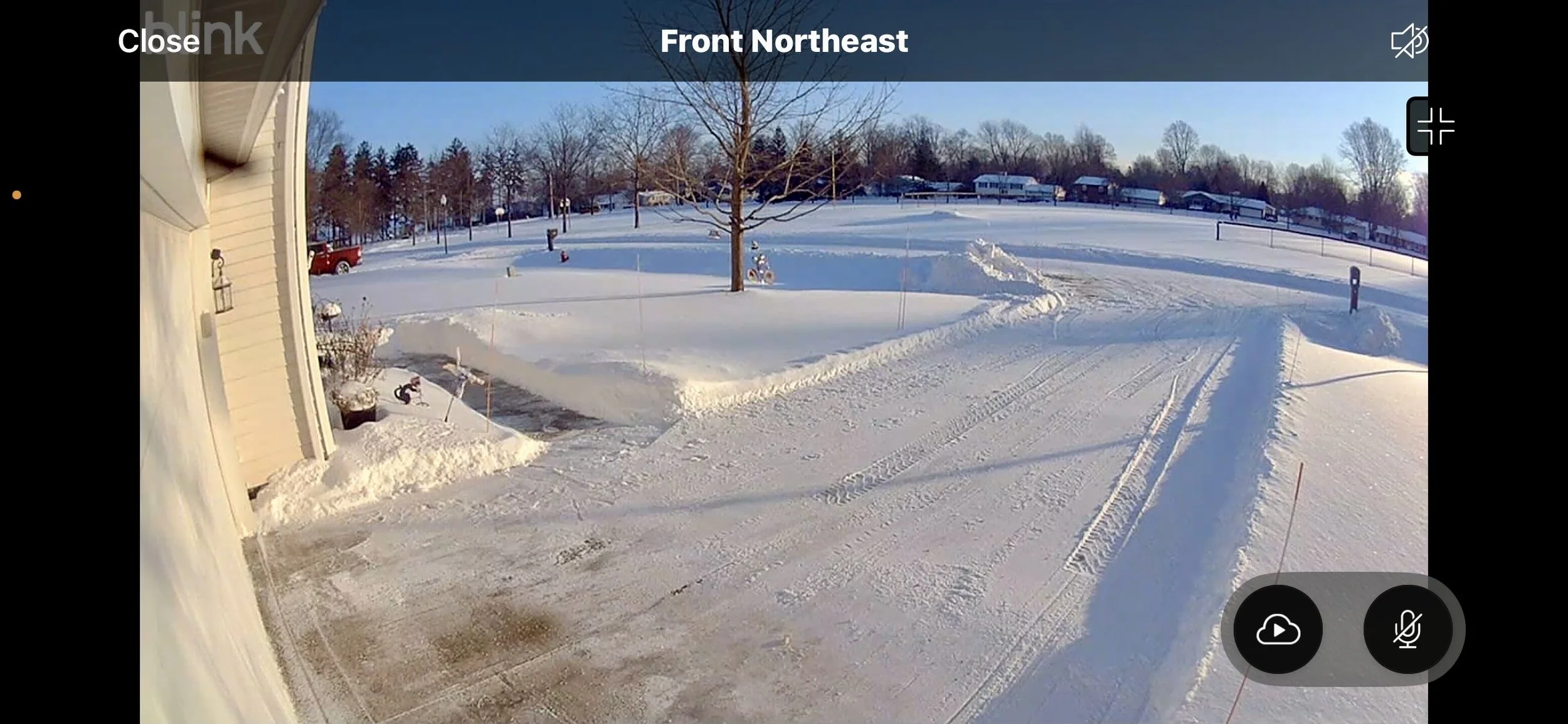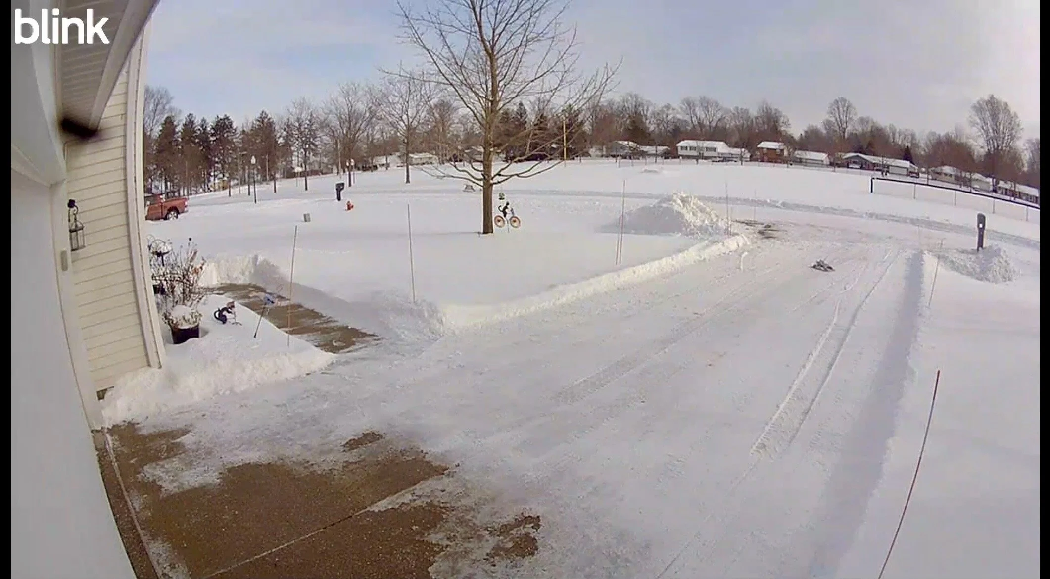 The “walls” of the walkway are about 18 inches now. There is still a layer of ice under the snow on most of the driveway. But the areas for delivery drivers to walk, are clear. It was about 4 degrees Fahrenheit at this point. Notice the clear skies.