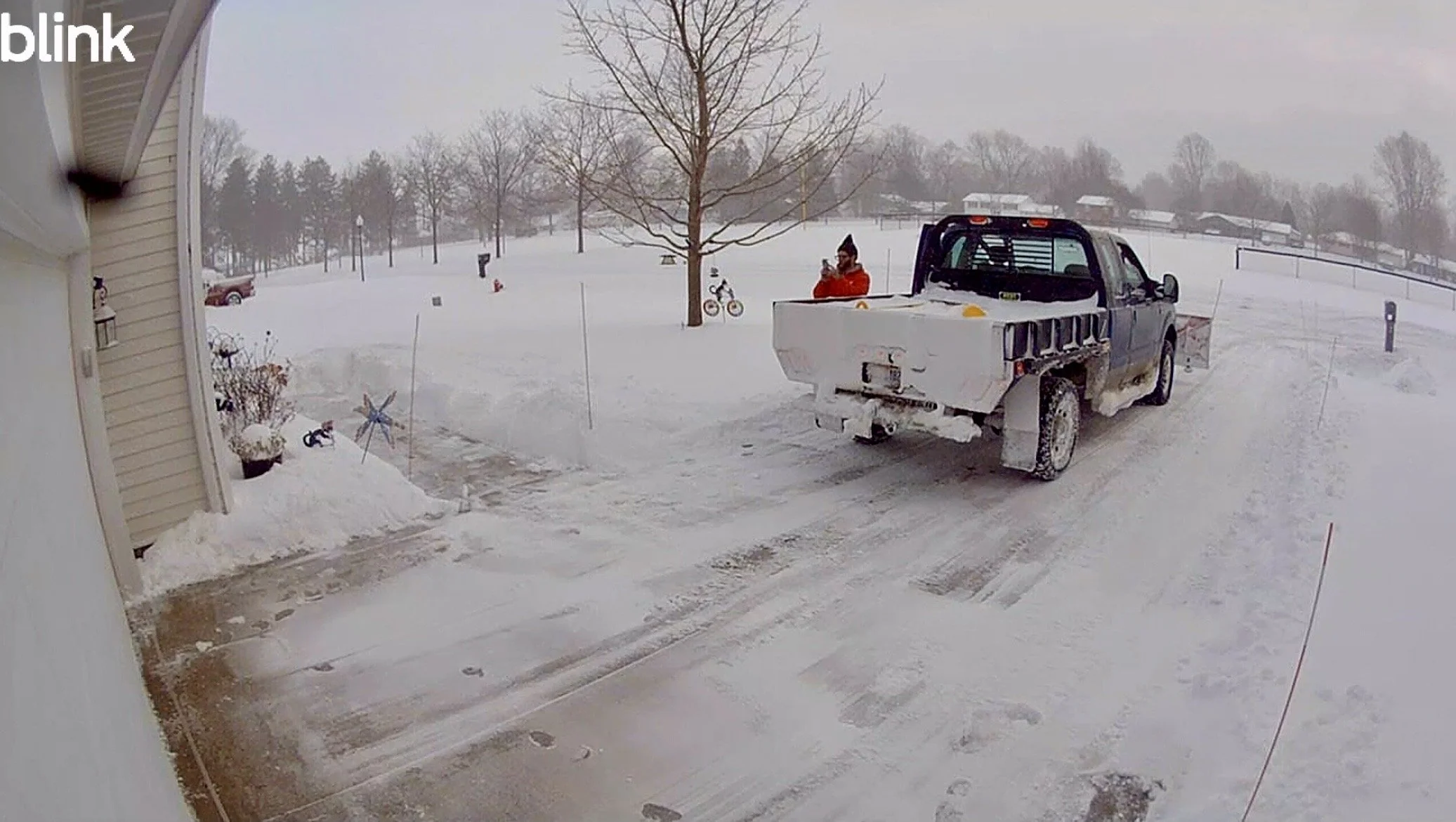 Notice the drifting already climbing the walls of snow around the driveway and walkway.