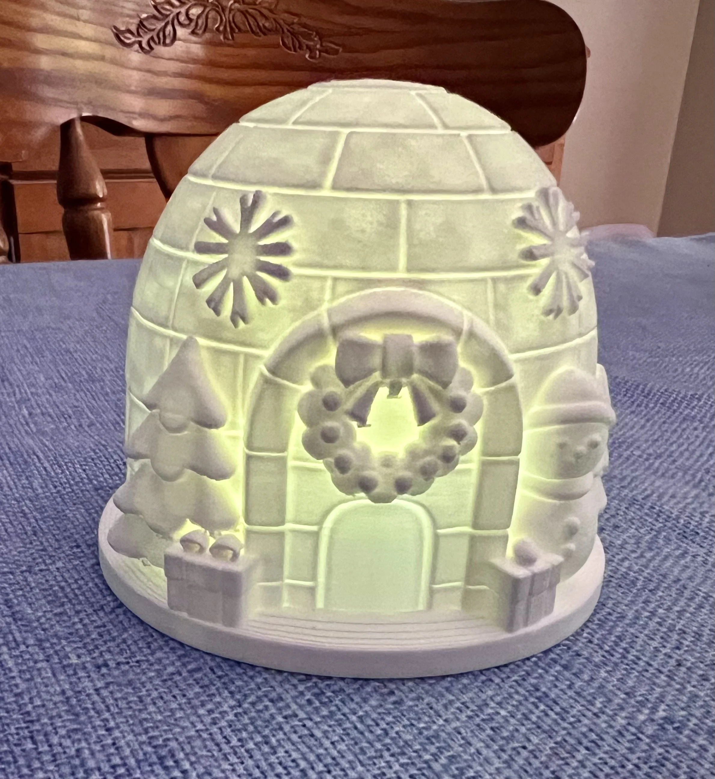 I really like this one with the penguin inside. The designer made the “skin” of the bird thinner than the igloo, so it glows from the tea light.