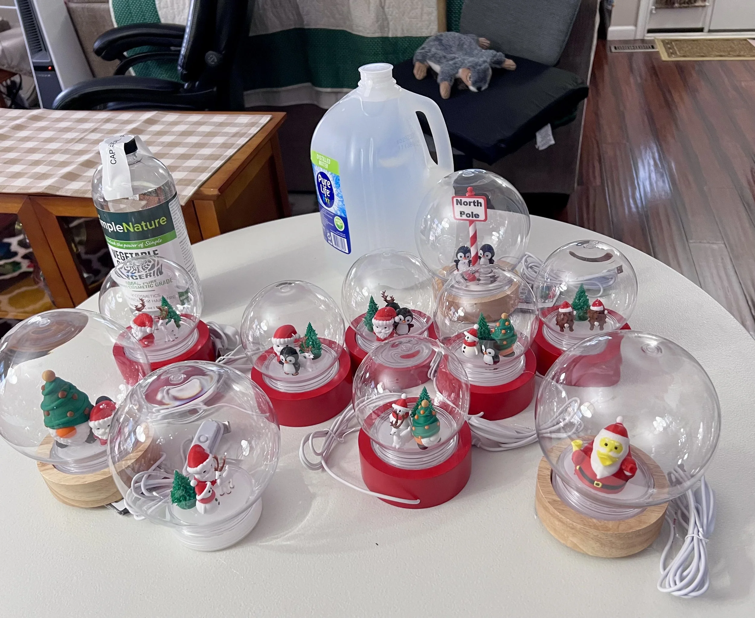 As for getting the figures to stay upright, I tried super glue, and it did not hold the figurines to the silicone bases. So, I tried the hot glue gun. It wouldn’t adhere to the PLA figurines. I tried epoxy, and that did stick to the silicone, somewhat. So, I then used superglue to connect the figurines to the epoxy. It seems to be sticking, most of the time. I was going to fill the globes with distilled water and glycerin, but rethought that idea. These are going in cardboard boxes that will be in the USPS system for a few days. If they didn’t leak immediately, they very well might freeze.
