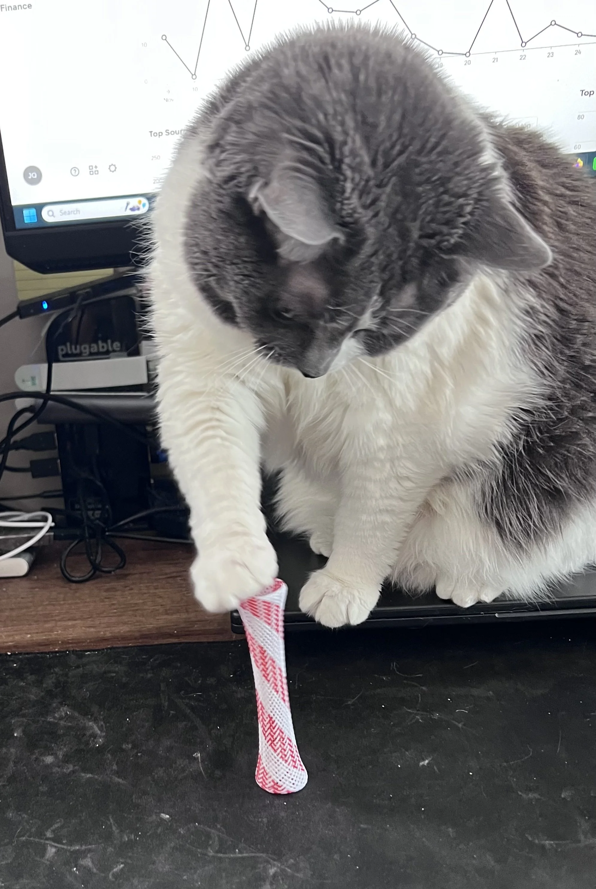 The other “four” is this was the fourth gift day of Kitty’s Advent Calendar from her southern cousins. When I opened it up for her this morning, I thought it was one of those “Chinese” finger handcuff things we used to get as kids. Fortunately, my fingers would not fit.