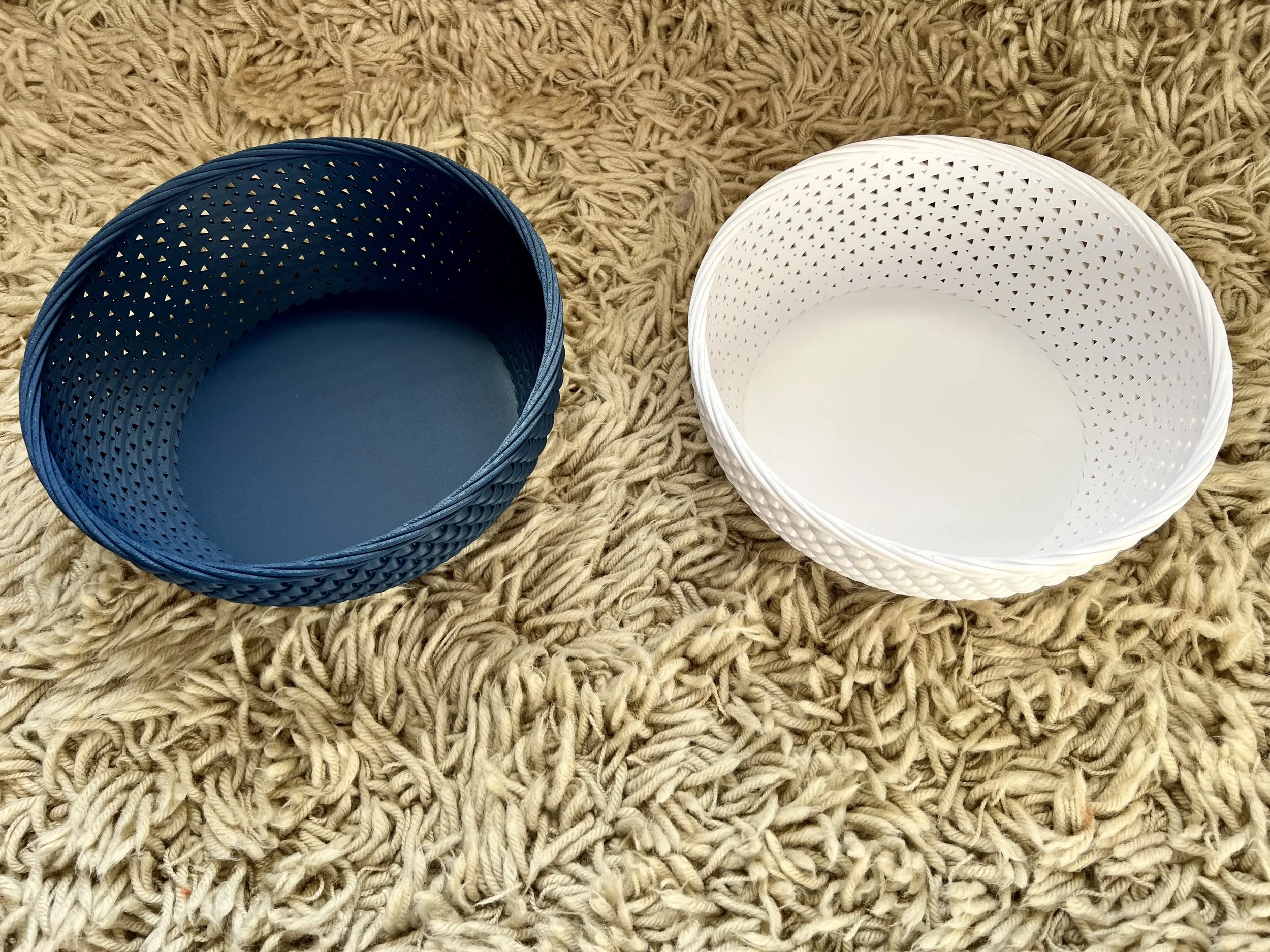 So, anyway, I needed something to contain all of the fruit. I checked for 3D models and printed off 2 of these bowls. One in White PLA, the other in Blue PETG — used both printers. The bowls took just under 14 hours to print and finished at 03:15 this morning. And, both worked first time and look really good.
