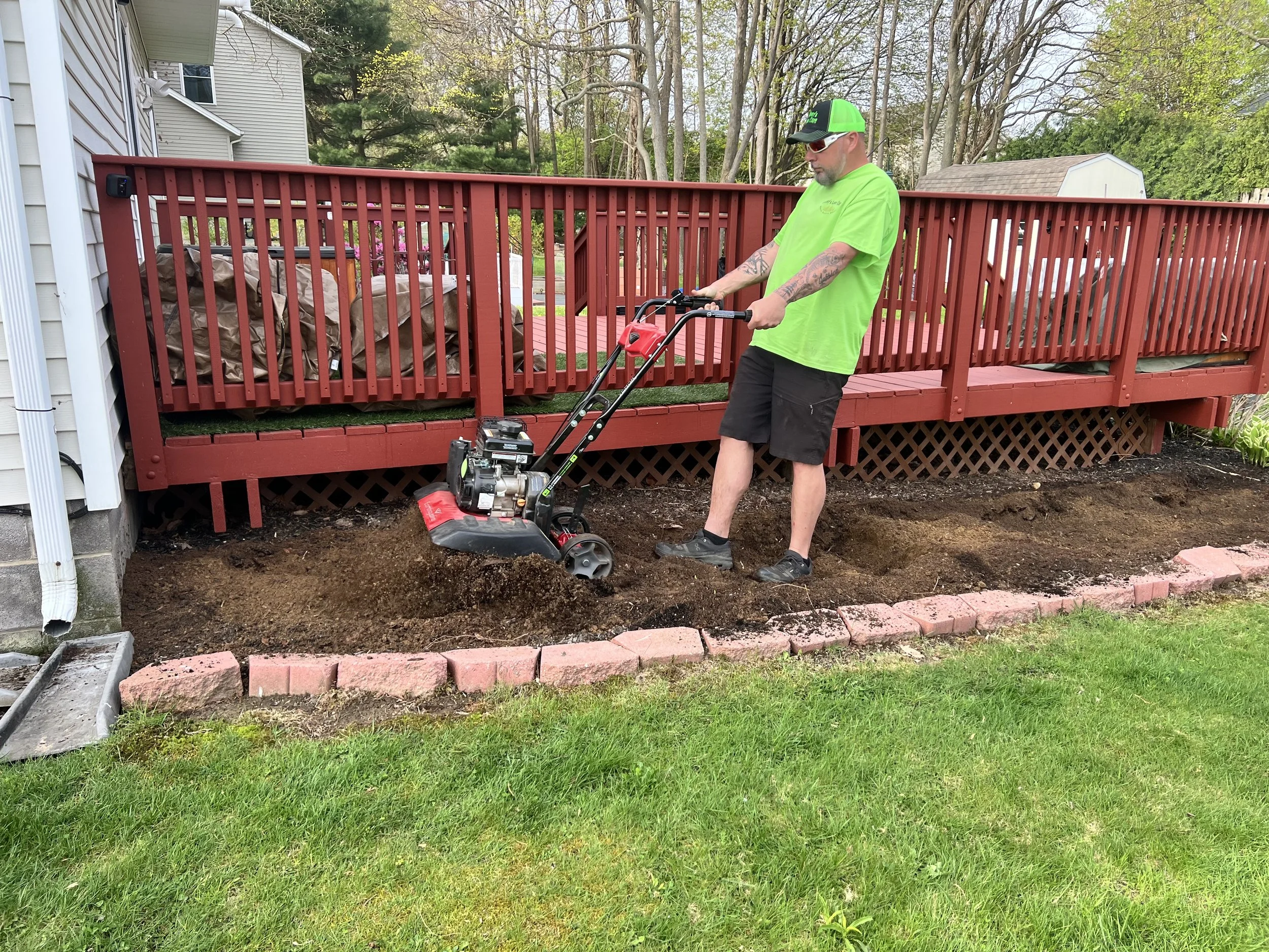 Bob Rototilled the bed to mix up the soil and get it ready. We did throw down 16/16/16 fertilizer to help with the new plants.