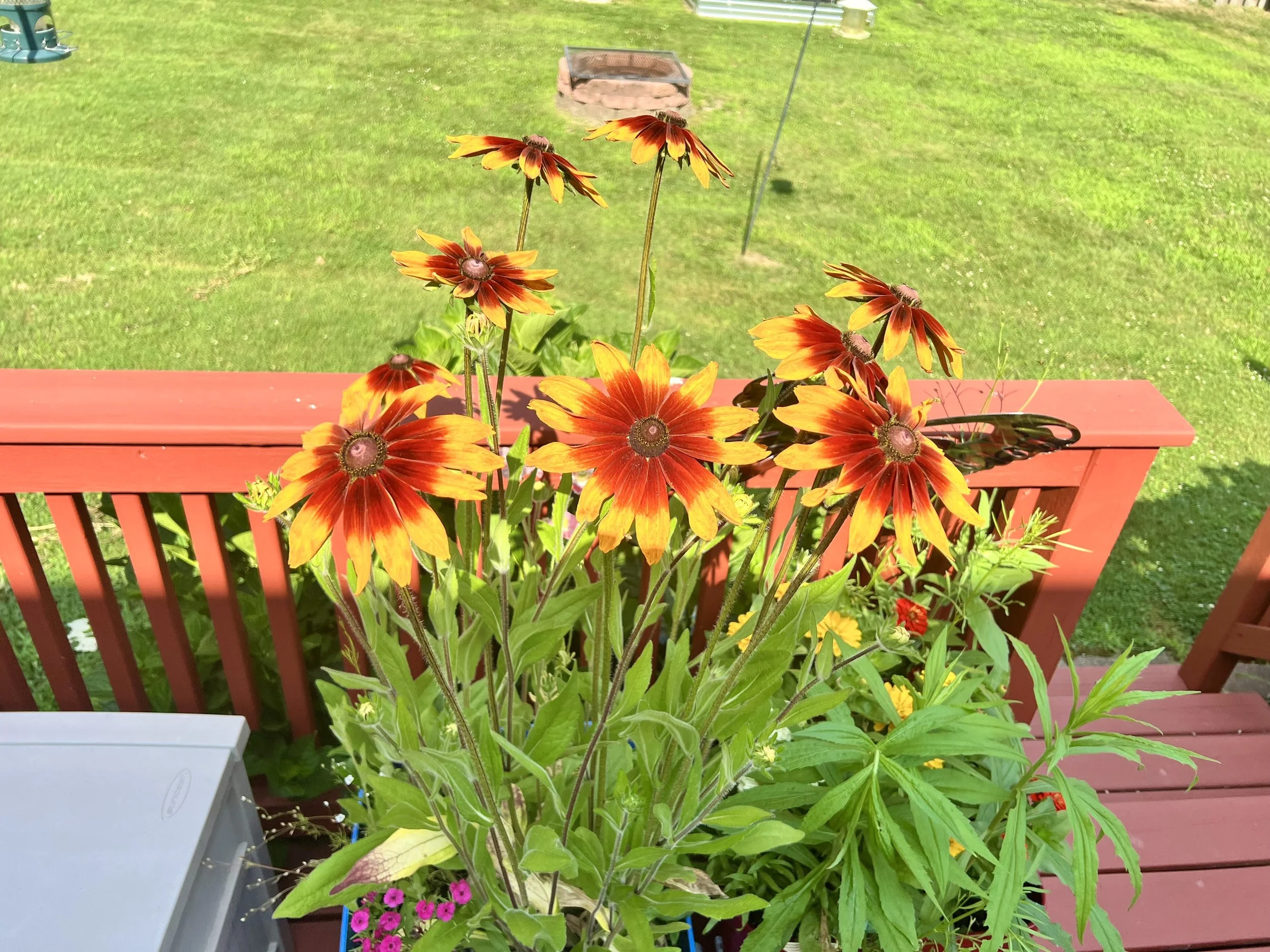 All of these sunflower type flowers are from seeds from last spring. I put no new seeds in these self-watering containers this year. First a bunch of wild-flowers popped out, and now these midsized sunflowers. Quite the display.