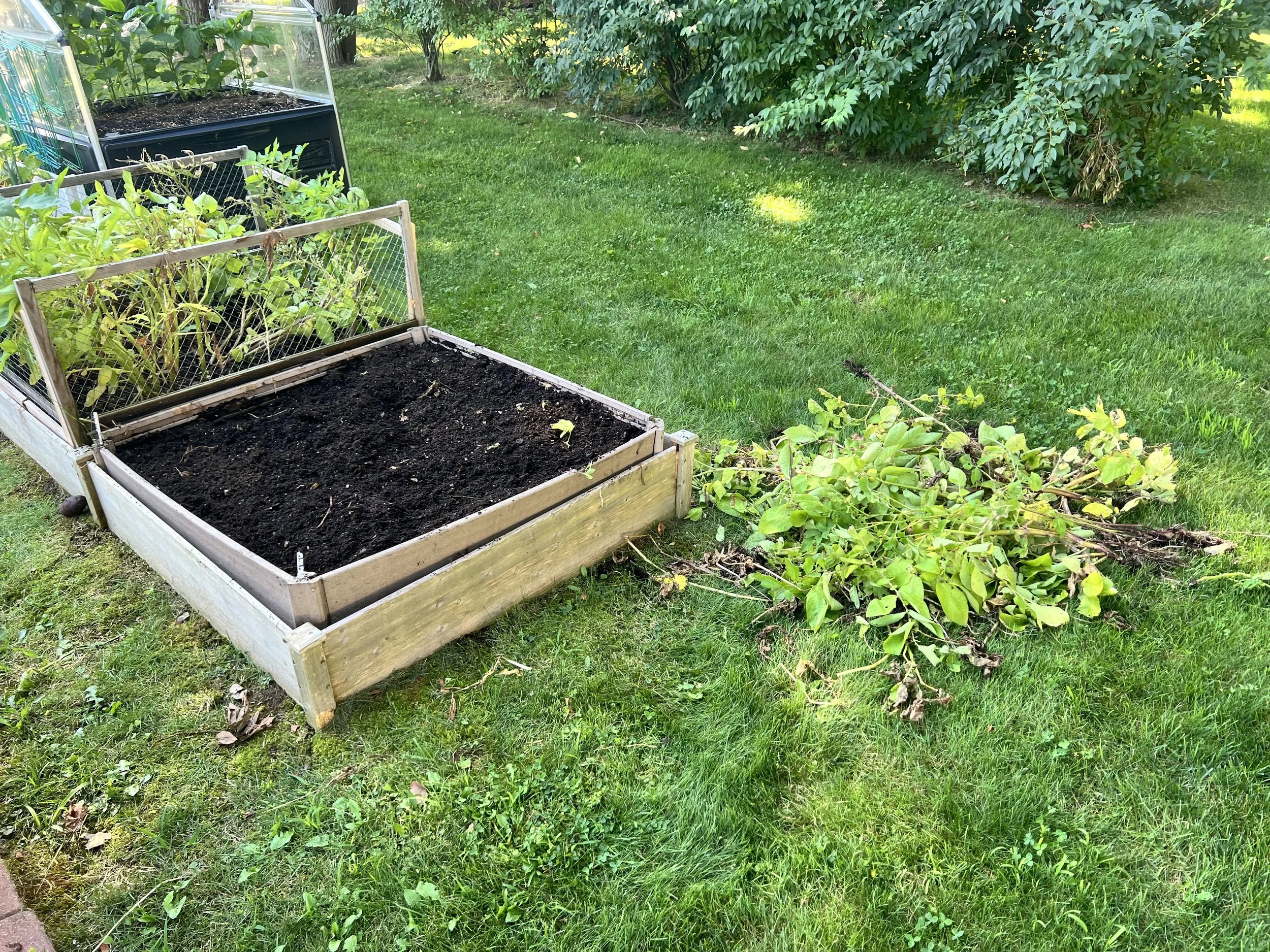 Ah, I pulled all of the potato plants in this 3.5×3.5 bed and harvested the potatoes. BTW, I am just going through the saved photos in order. I have no idea what will show up next.