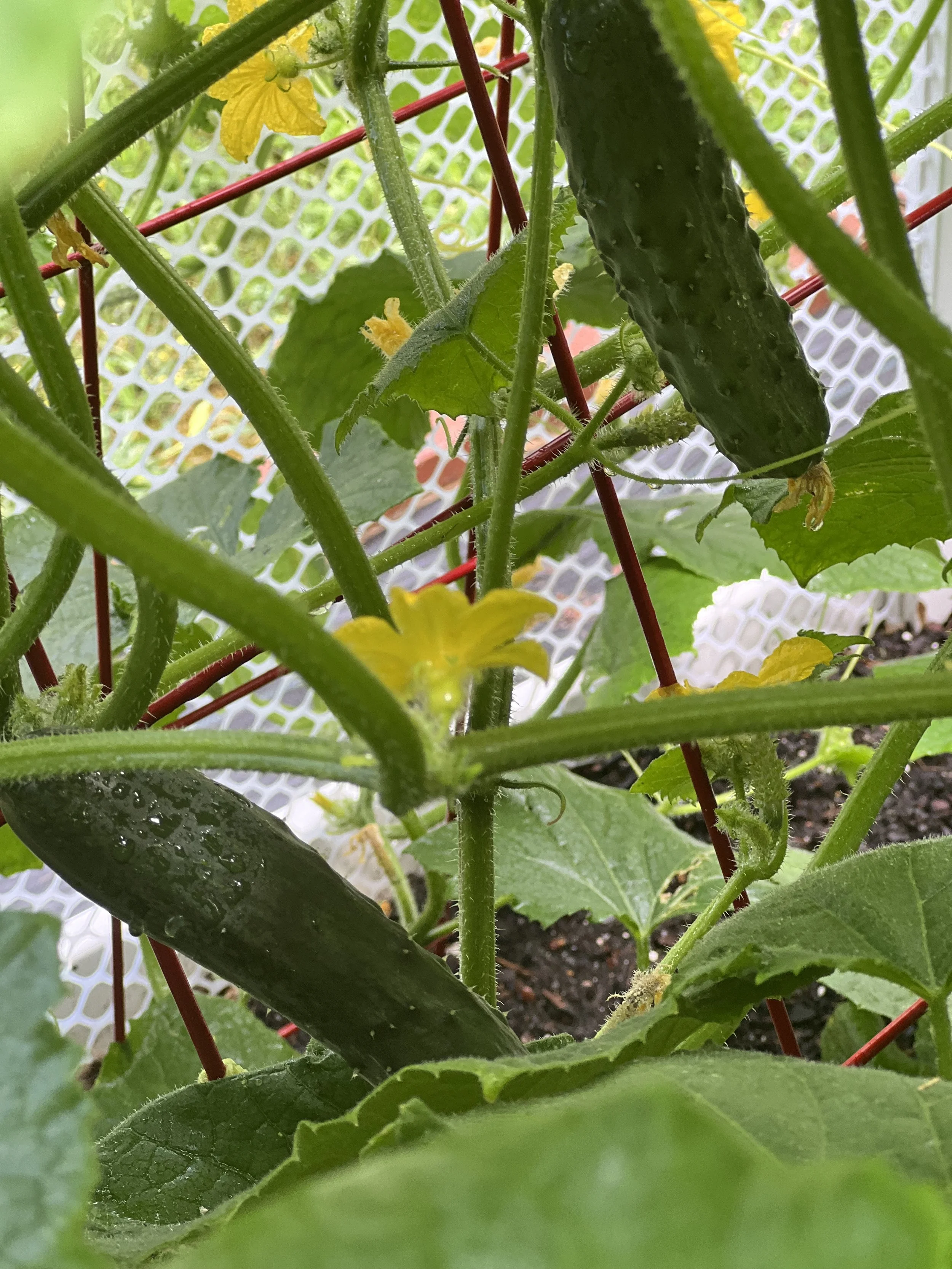 Cucumbers are finally producing. Here are the first ones from a picture 3 days ago. This one was certainly picked by now.
