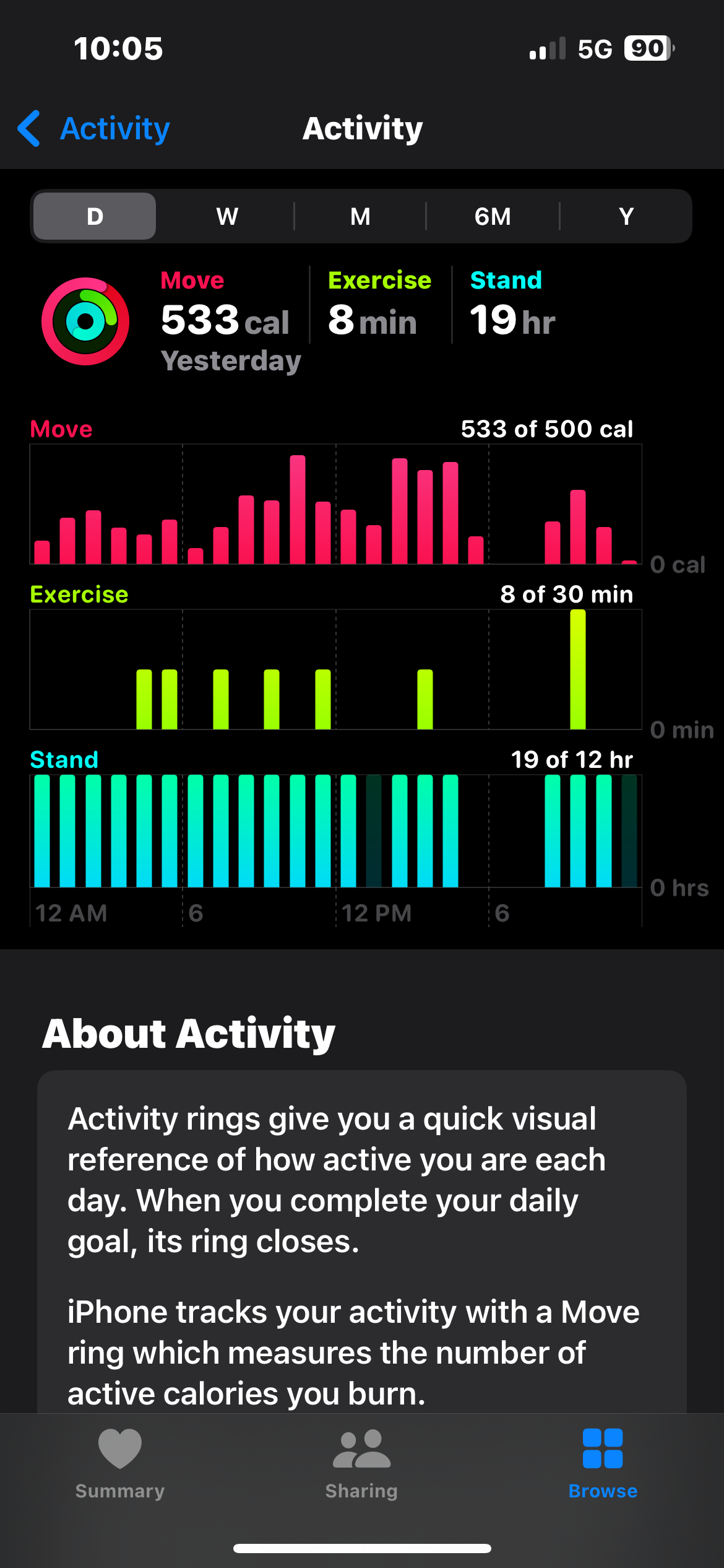 Standing hours. No guarantee I was actually on my feet every hour of the night and morning, but, the watch took my activity flopping about in bed to be the same as standing. I think the 1 pm grey bar was when I was sitting at this desk typing or watching YouTube without getting up. And the dark spot from like 5-7 pm was when I put the watch on the charger and forgot about it.