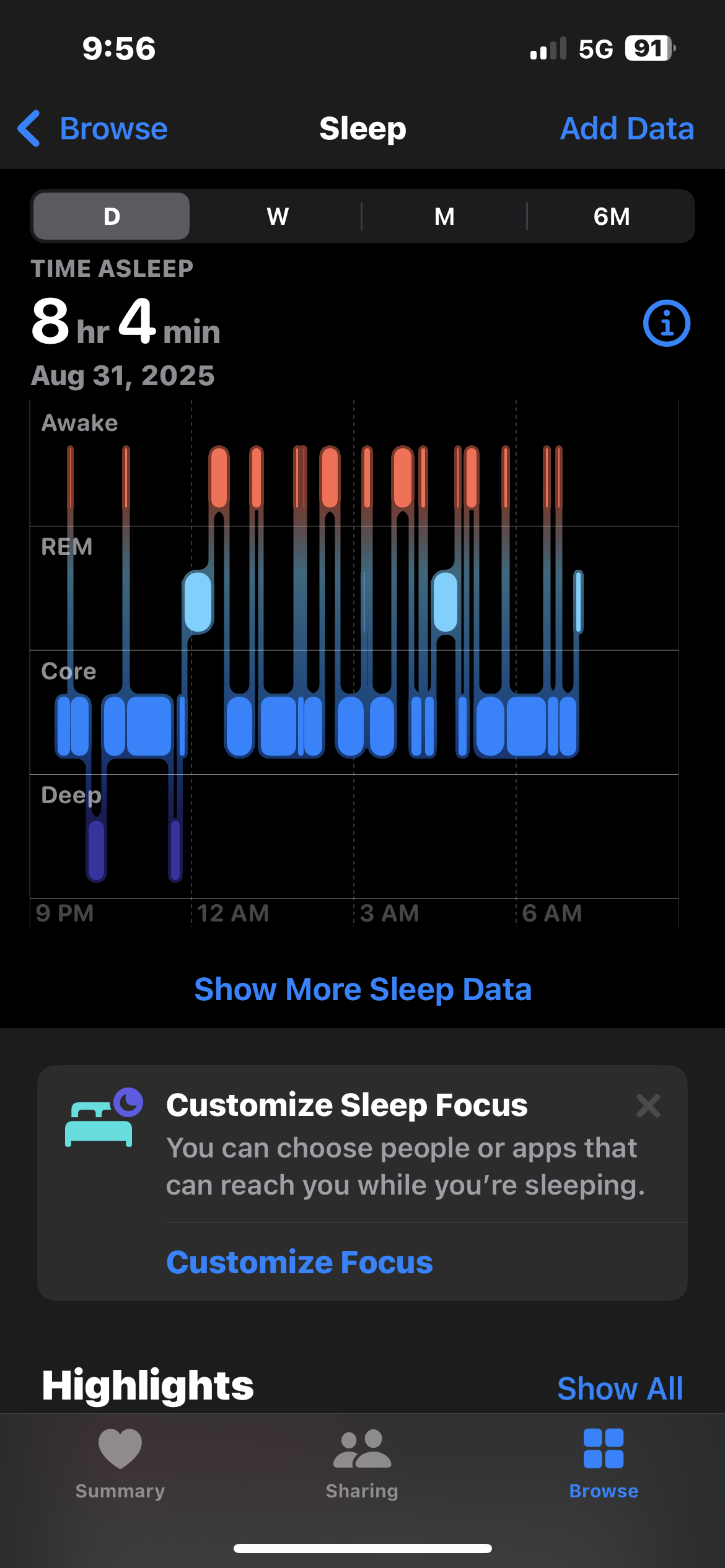 To Apple, “Time Asleep” means overall in bed. The parts that matter are “Deep Sleep” and “REM”. You can see I had a couple “full” cycles of deep and REM before midnight. Split, with being awake in between, of course. Those added up to almost 45 minutes. Then just a couple more quick hits of REM later in the wee hours. Maybe another 45 minutes total. “Real Sleep” therefore was about 1 and a half hours spread over 8 hours. Notice the red on top. That is when I was AWAKE and the watch knew it for sure. Mostly because I was flopping around.