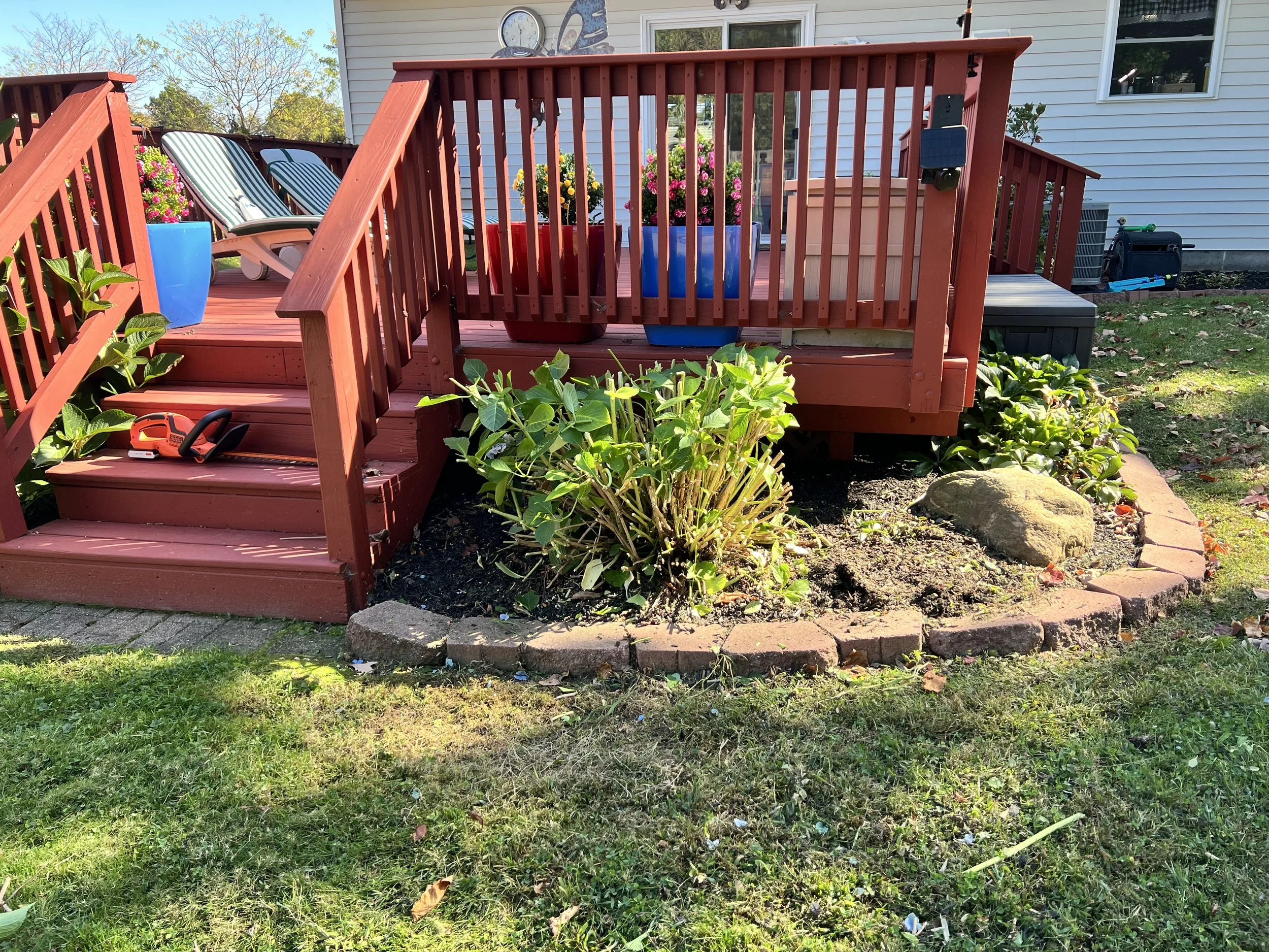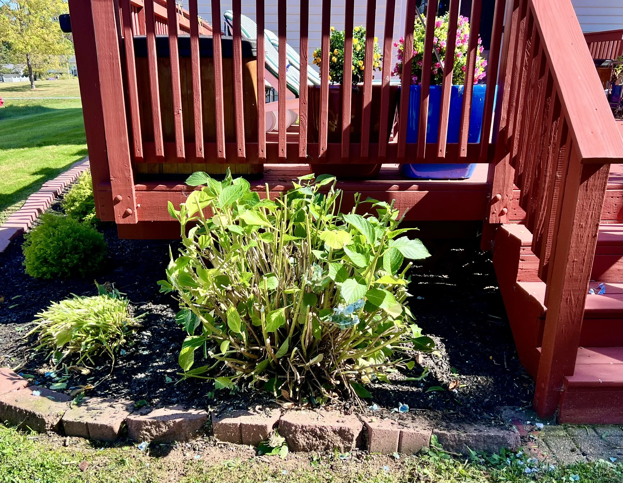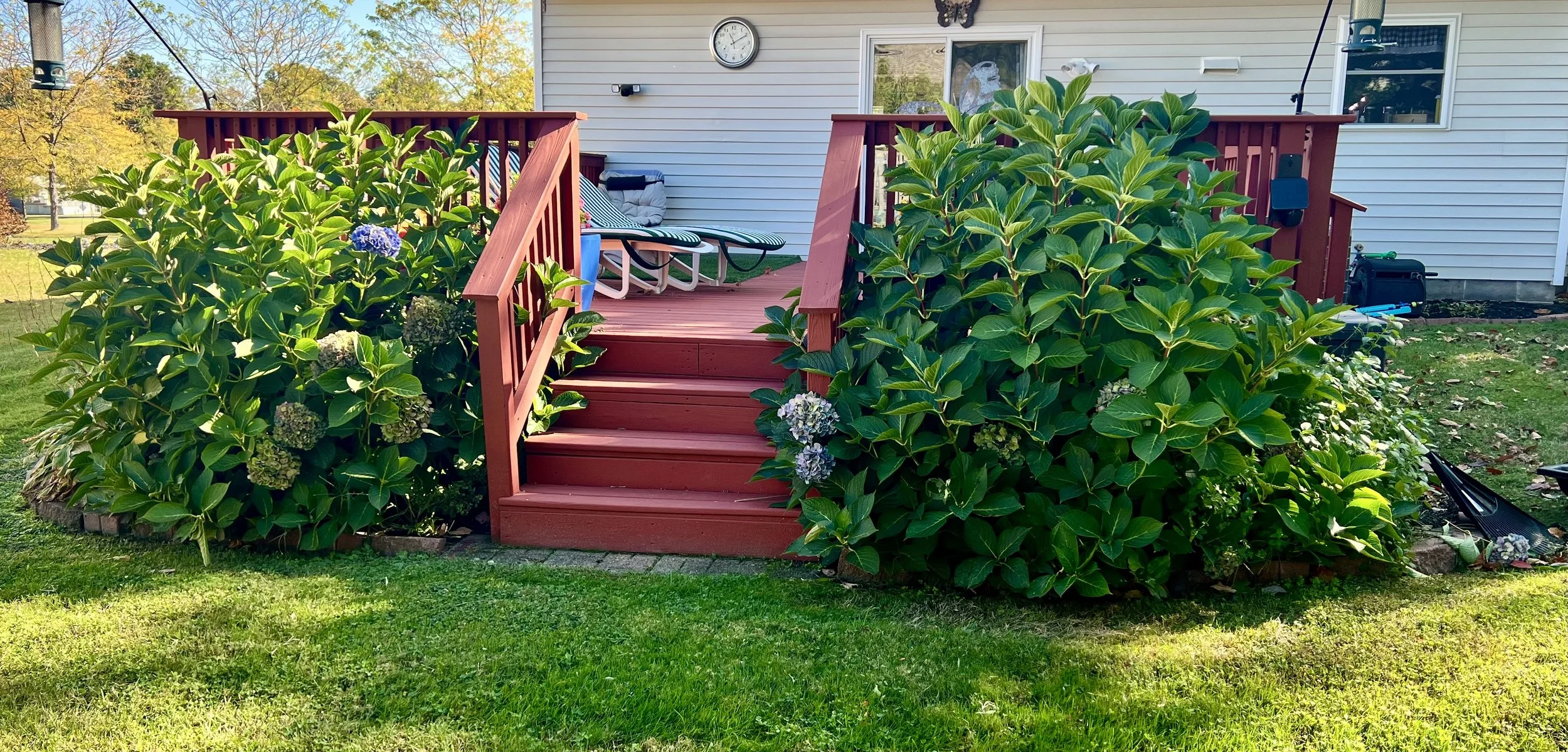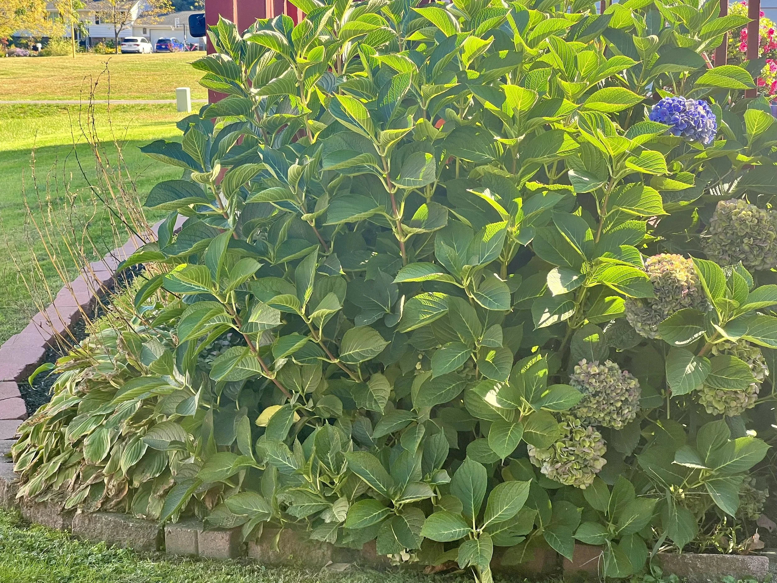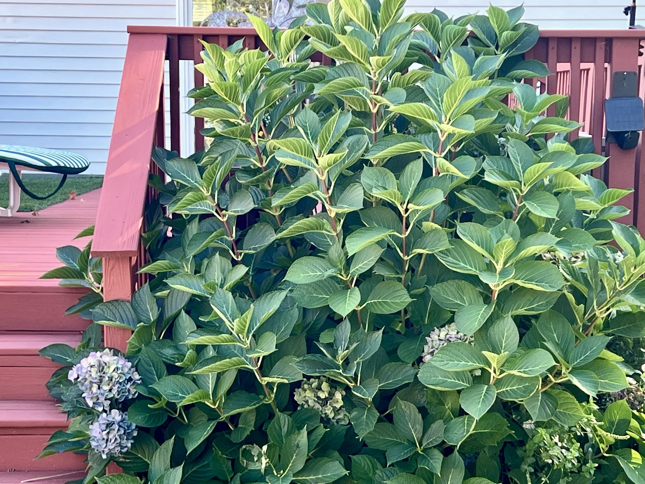 So, I got my big butt outside and finished the yard plant cutting that I will do this year. My two compost bins are overflowing with greenery and such. Today I attacked the Hydrangea bushes out the back of the deck. This spring, the lawn service trimmed them down to little basketball sized plants (about 1 foot in diameter). Even in this drought year, the foliage would not stop growing. Up and over the deck and the railings. Look at this mess.