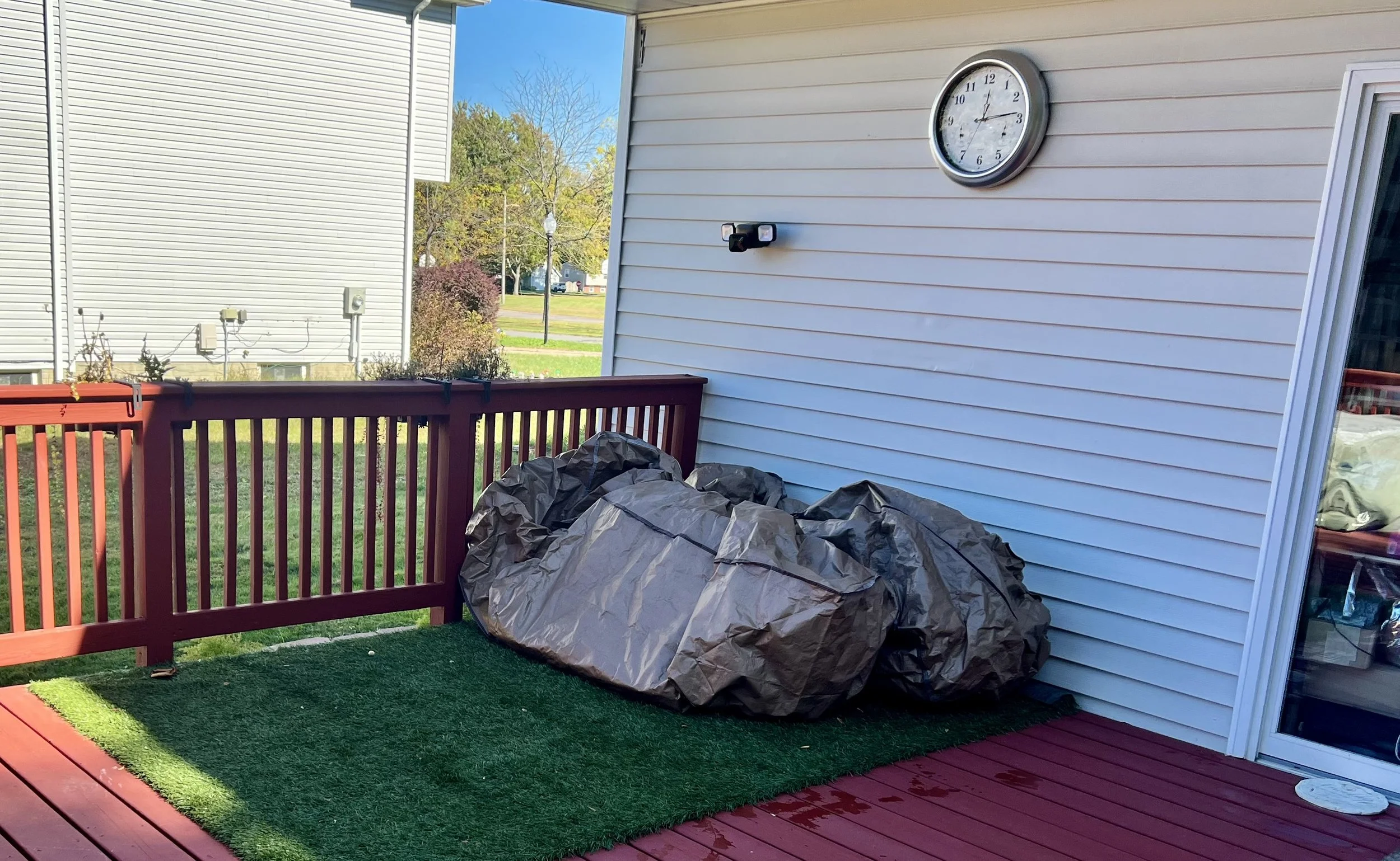 Lounge chairs and pads are bagged and tagged. Notice the time was 12:15. About 60 then, but not too bad because winds off lake are blocked by neighbor’s house. Sometimes!!!