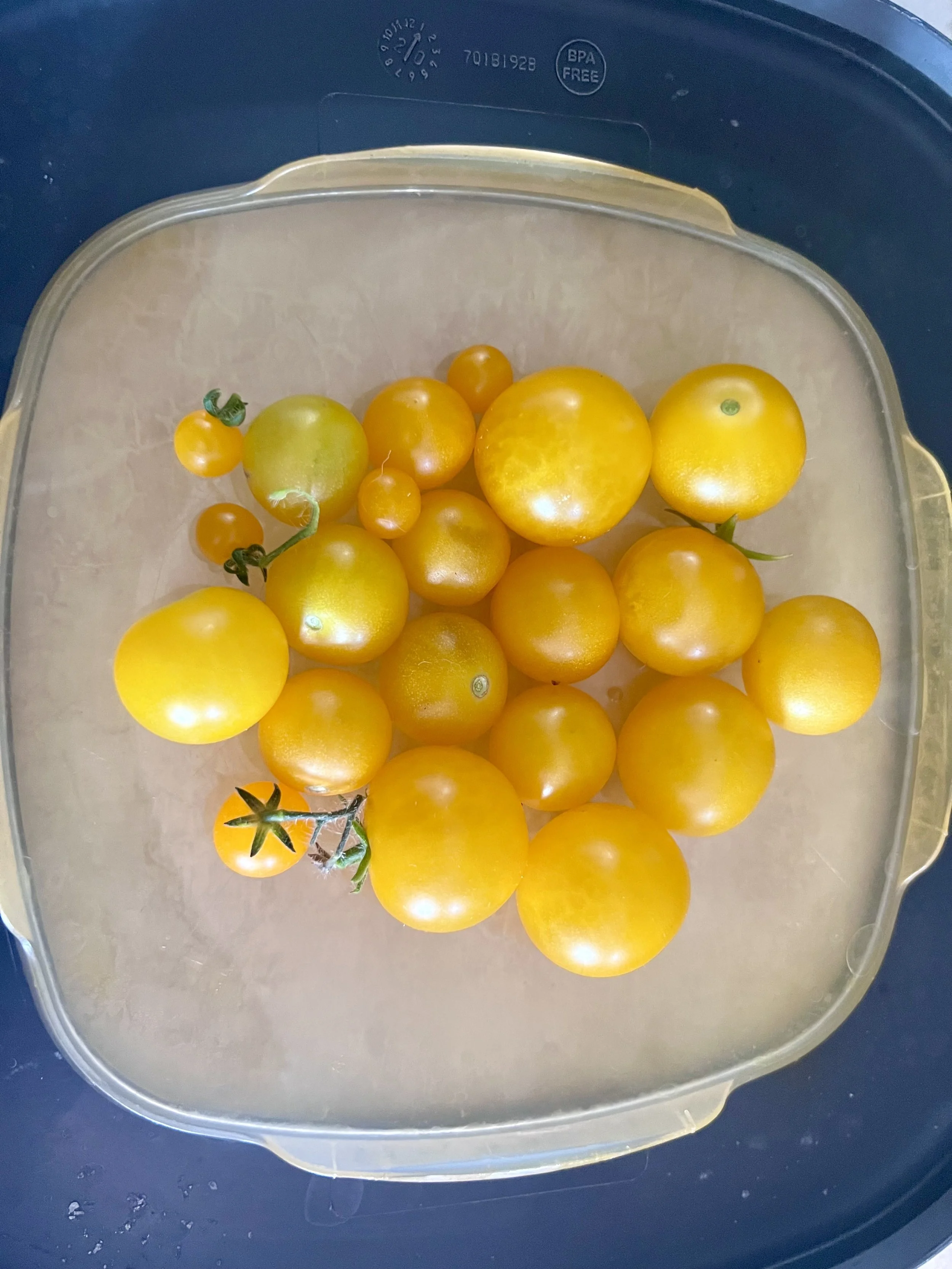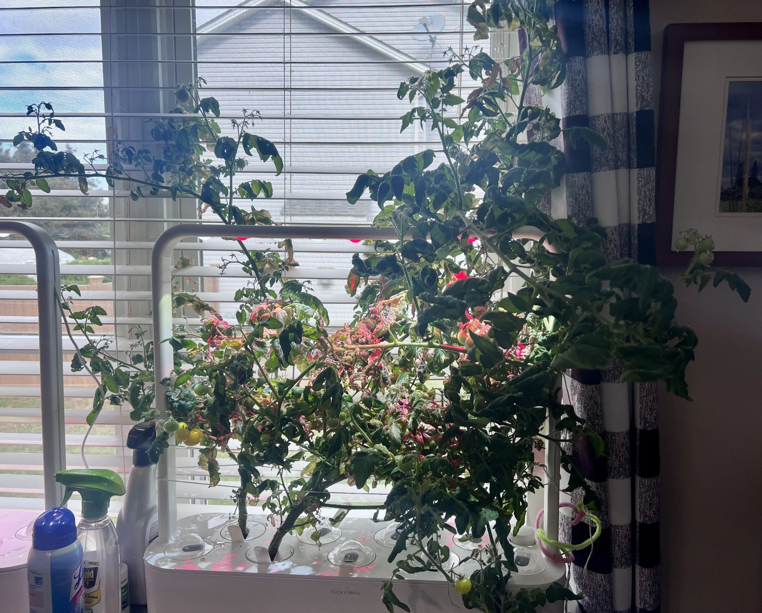 The indoor plants are still growing and blossoming and fruiting. I pulled the old Basil plants from the Click N Grow to the left, and put in 3 seed pods of the same yellow cherry tomatoes.