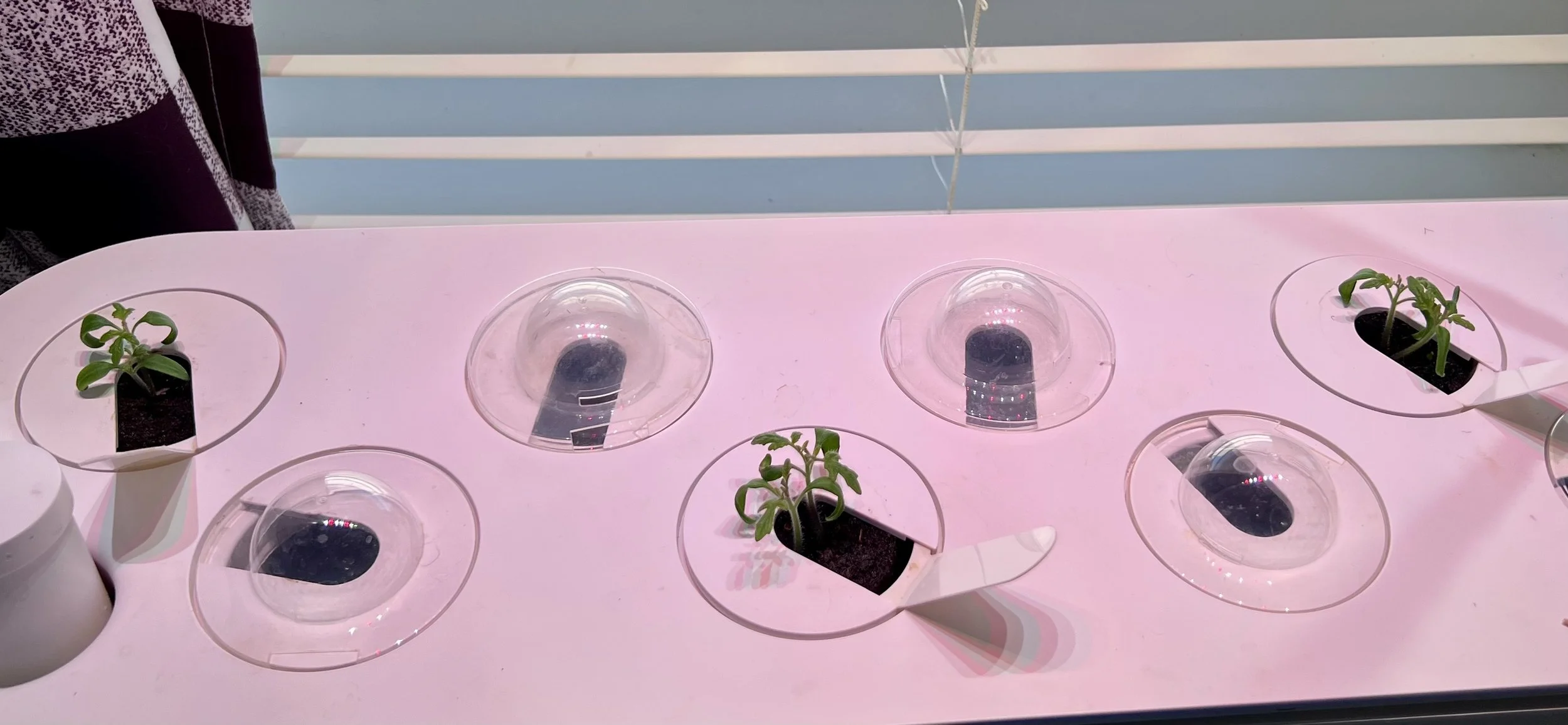 Oh, remember a couple weeks ago when I showed the latest “harvest” of indoor tomatoes, and mentioned I did a cleanup and started new seeds? Well, here are the 3 pods I put seed into.
