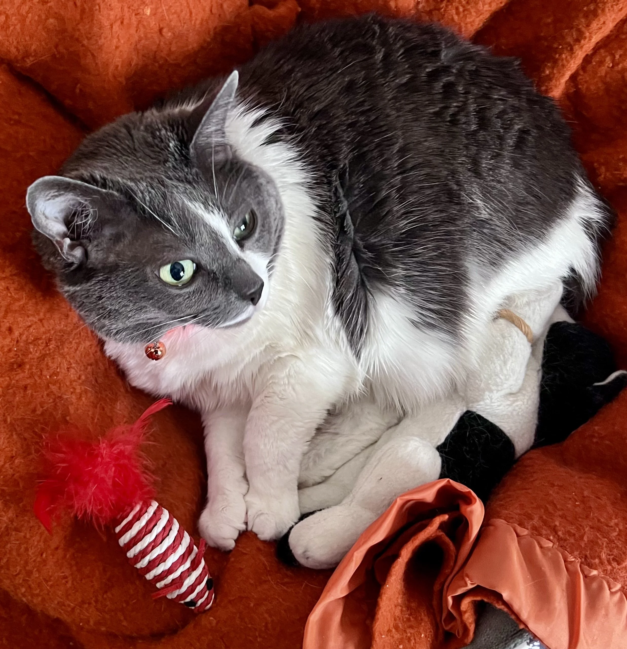 And here is my Nurse, Miss Kitty. The little red mouse is from an Advent Calendar sent to her from her southern cousins in Florida. And she is laying on Mini Kitty. That’s why it looks like she has so many legs.