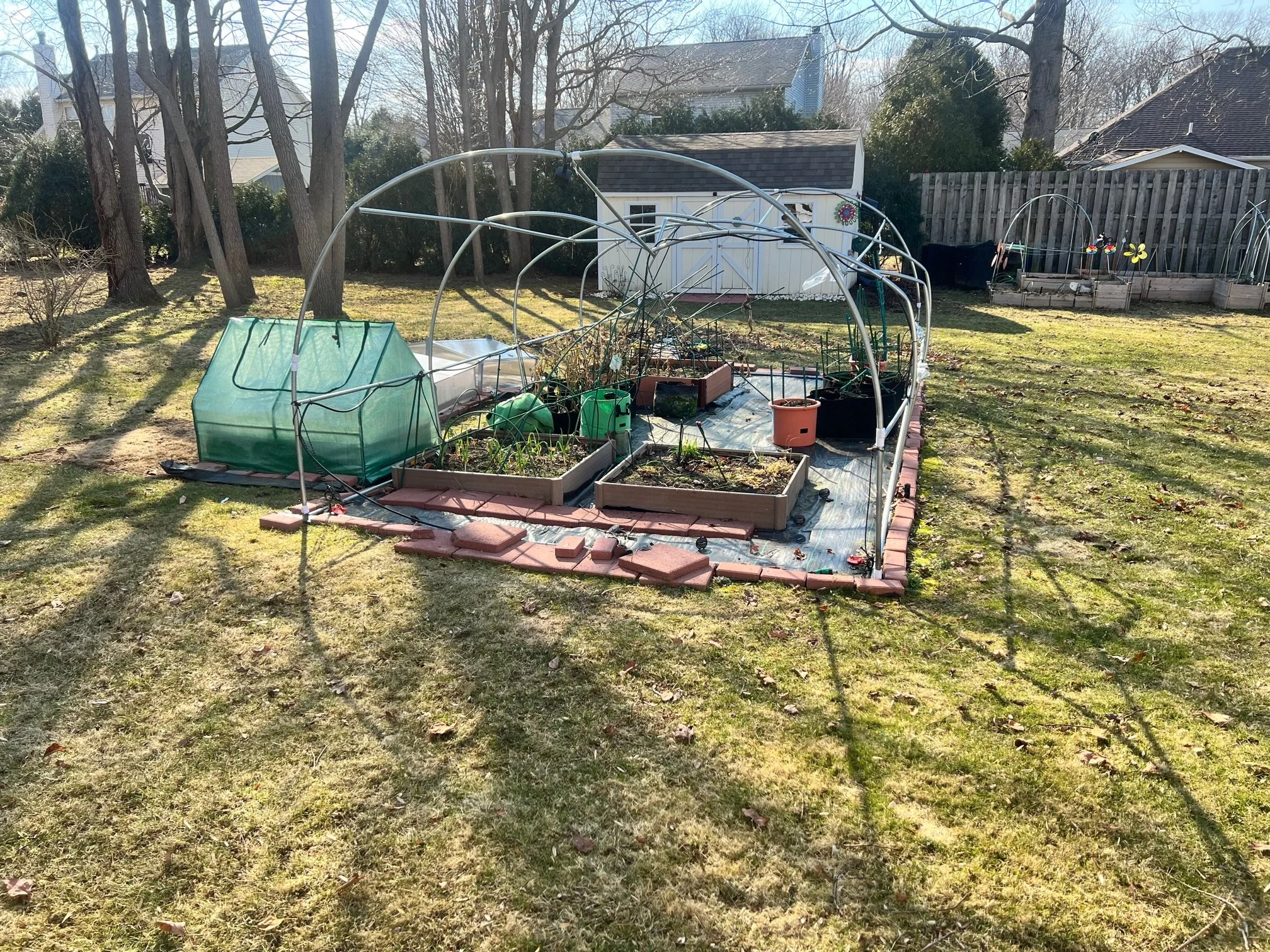 This is the beginning of a new structure. This is a 10x10 Umbrella tent like green house. It covers the main area, and I am using smaller cold frames over the other beds.